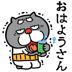 おじさん臭い服巻姿で、癒される気分にもなる黒猫おじちゃんのスタンプです。
