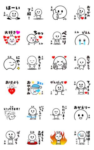 エミ,えみこ,恵美,絵美,笑,栄見,榮美,恵望,英美, 絵巳,恵実,栄美,恵美子,咲子,絵美子,笑子,栄見子,恵望子,英美子, 絵巳子,恵実子,栄美子など【えみ】の名前入りスタンプMIKIKUN より発売