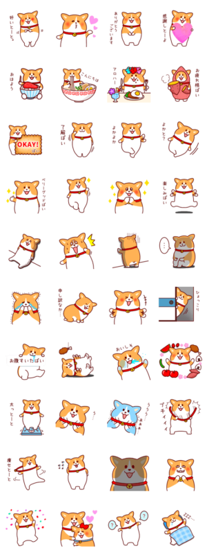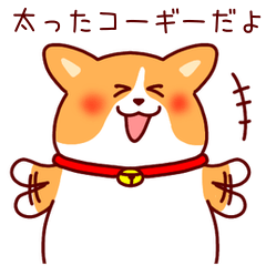かわいい犬、コーギーのスタンプです。食いしん坊なので太っています。太りすぎて首輪が外れなくなりました。博多弁をしゃべります。コギえもん。