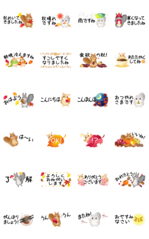 エゾリス、シマリス、ナキウサギ、モモンガたちが可愛く動く!秋が旬の食べ物や紅葉がふわふわ舞う、大人可愛いポップアップスタンプ。毎日使えるワードで使いやすさも◎mayurimu より発売