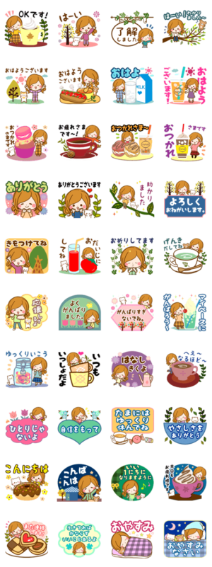 ドリンクやスイーツ草木や花がいっぱい♪どこかほっと癒されるような手描きスタンプです。優しい気遣いの言葉と日常用語が揃って使いやすい☆「ほのぼのカノジョ」シリーズルルー より発売