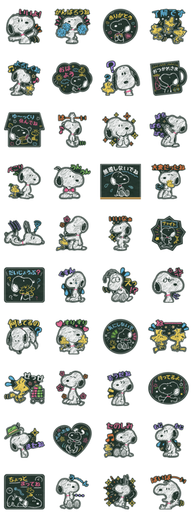 黒板に描いたようなチョークアート風デザインで、いつもと違うスヌーピーの表情が楽しめます♪優しい気づかい系のメッセージを中心に、誰にでも使えるスタンプです。
