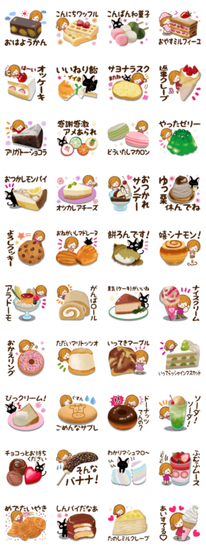 スイーツのイラストがどれも美味しそう、そして各々のスイーツにはそれを使ってのダジャレが添えられ、とっても手が込んだスタンプです。