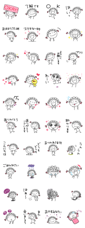 LINEスタンプの日。LINEの定番が勢揃い。「こんにちは」「OK」から「ペコリ」まで。日常会話で使いやすい定番の言葉集。くるリボンでテンポよくメッセージを届けよう。Mami / エストループ より発売