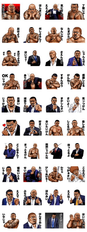 見た目は、ヤクザ ヤンキー アウトロー系だけど、本当は心優しいそんな人向けの、顔は恐いが本当は優しい強面(こわもて)スタンプ 極道クラスターの、広島弁 バージョンです