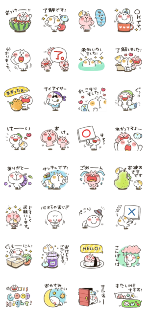 まるぴ、くまぴ、うさぴ、ねこぴ、トリさん、ネコさん、みんな集合したほのぼのスタンプです。OKや承知など了解を意味するスタンプ多めです。