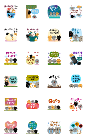 ちびねこイッパイのスタンプ、飛び出すバージョンです。 日常会話に使いやすい言葉いろいろ、敬語も入っています。