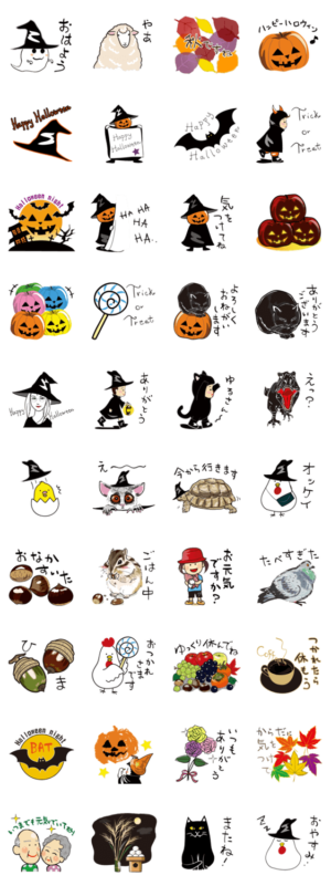 ハロウィン、かぼちゃ、にわとり、羊、栗など、秋の挨拶、ゆるい会話に使って頂けたら嬉しいですkana より発売