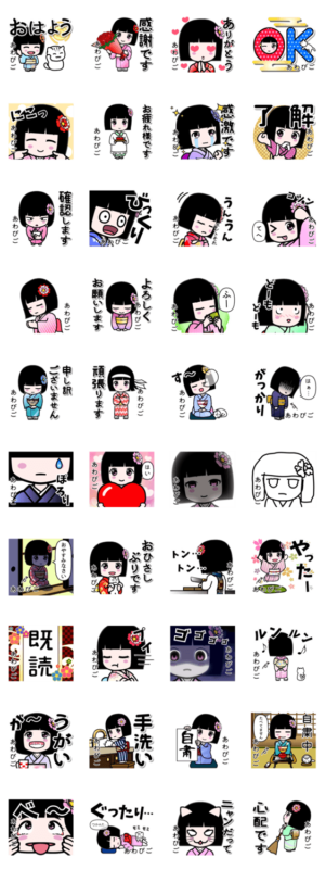 『あわびご』用のよく使う言葉を詰め合わせた座敷童子のスタンプです。和服 着物 浴衣かがりひな より発売