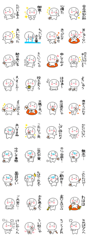 しろくてまるいキャラクターの武士語:もののふご:ぶしごの日常会話のスタンプです もるきゅた作もるきゅた より発売