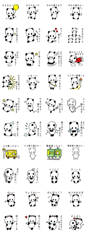 帰宅連絡用のパンダちゃんスタンプです。帰るよ、今から帰ります、もうすぐ家着くよ、待ってるね、早く帰ってきてね…etc.パンダちゃんと一緒に、楽しく日々の連絡を!ひらぎゆりこ より発売