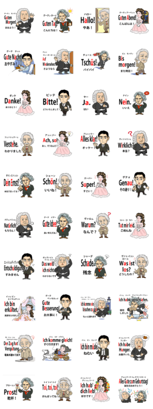 ドイツ語を話す偉人たちのスタンプで、役立つドイツ語のフレーズを覚えましょう。意味だけでなく、読み方やアクセントもひと目でわかります。