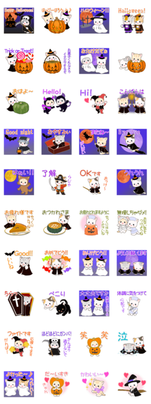 赤ちゃん猫たちが可愛いハロウィンコスプレ♪ 毎日使う言葉もたくさん入っていますので、ハロウィンの時以外にも使ってね。文字大きめです。つのっち より発売