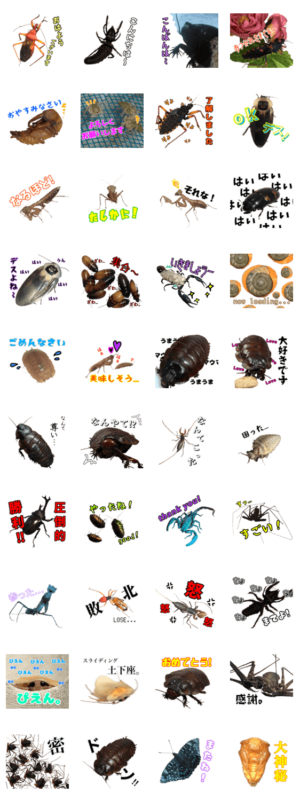 珍しい虫、奇蟲の素材を提供させて頂き作成しました リアルな虫たちの不思議な世界をスタンプで! 面白く、シュールに可愛く美しく!コミュニケーションや挨拶に。招き猫んぶ より発売