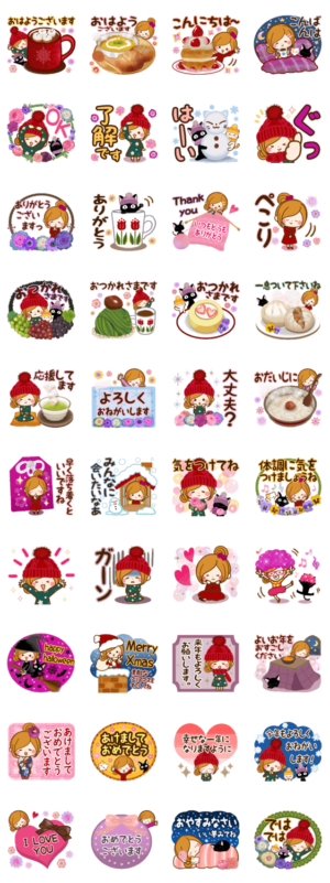 涼しい~さむい季節にぴったりな華やか癒しスタンプです♪敬語が多めで使いやすく、クリスマスや年末年始の挨拶も入ってとってもお得です♪【ほのぼのカノジョシリーズ】ルルー より発売