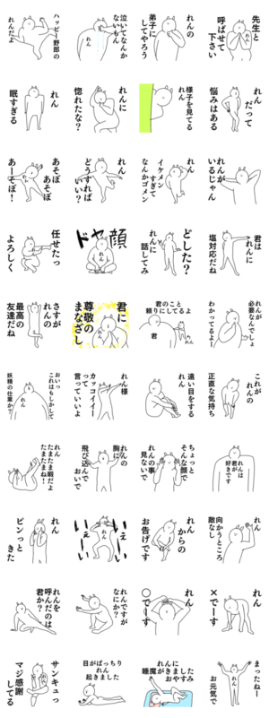 れんちゃん、れんくんが使える名前スタンプです。シュールで面白いバージョンです。レン、蓮、恋、廉、錬、練、漣など。