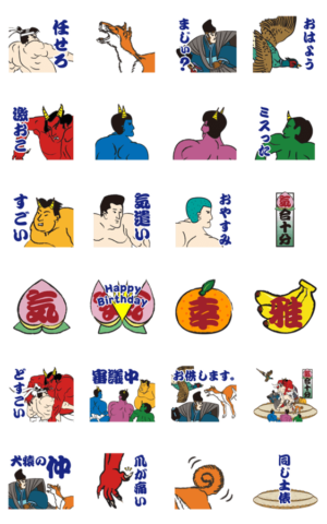 桃太郎と仲間達が相撲で戦うスタンプです。 鬼が土俵に仕掛けた呪術にも屈せず、心頭滅却して刃をふるう桃太郎の勇姿を描きました。気合十分なスタンプでトークを廻そう!Chinisama より発売