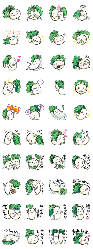 丸大根、長大根たちが、デフォルトスタンプっぽいリアクションをとっております。後半は若干昭和っぽいリアクションになっているカモです。お気に召しましたら幸いです♪