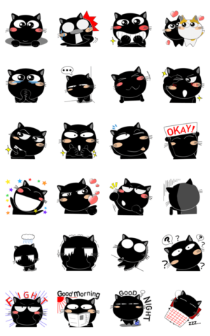 LINEの定番ポーズを黒猫ハッピーで再現♪LINEスタンプの日記念。表情豊かに、よく使うスタンプを揃えました。三毛猫の「みーこ」もコラボ!黒猫ハッピーでHappyに!