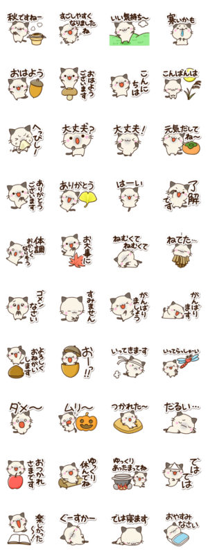 『ちびシャム』の、しゃむ猫スタンプの【秋編】です。どんぐり等、秋をイメージするものと、よく使う言葉を集めたネコスタンプです。ねこ好きな方にぜひ。【かたこ】かたこ より発売