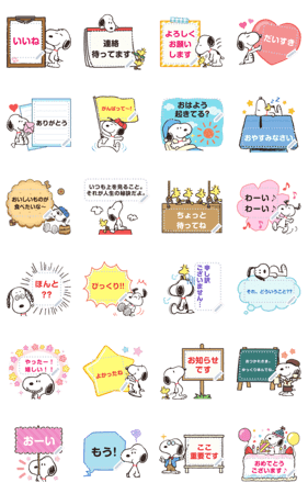スヌーピー メッセージスタンプは、自由にメッセージが書けてとても使いやすいスタンプです!いろいろな表情をしたスヌーピーがかわいいです!