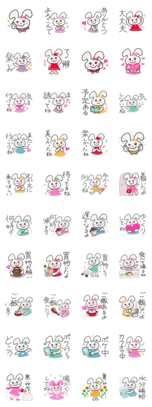 可愛いお洋服をたくさん持っているオシャレなうさぎ。可愛いお洋服であなたのメッセージを伝えます。家族との連絡に使えます。大きい文字で見やすく、選びやすくしました。