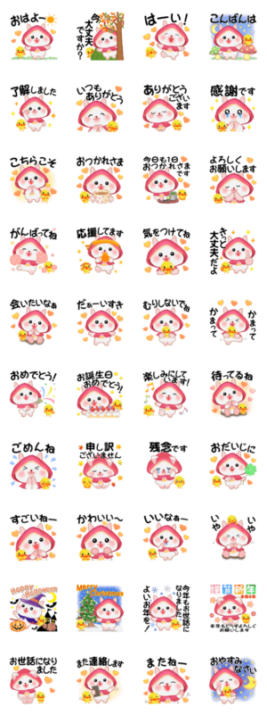 赤頭巾をかぶった うさぎのうさっぴの日常会話、クリスマス、ハロウィン等、秋に使えるスタンプです。めぐみん より発売