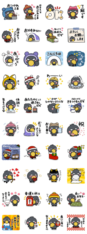 4コマ漫画でみんなのお世話役♡ハシビロコウのはしもとさんの冬スタンプです。使いやすい大人の敬語スタンプです。クリスマス・年賀入り!【作:いしいともこ】
