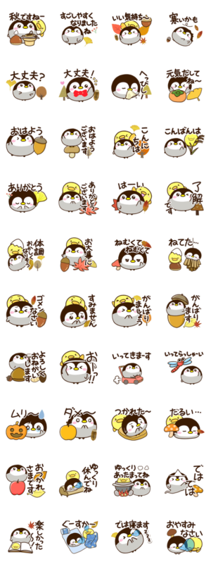 もっちりと丸いペンギンの『もちっぺ』。よく使う言葉やあいさつ等、秋の飾りをイメージしました。ひよこの『まるピヨ』も登場します。【かたこ】かたこ より発売