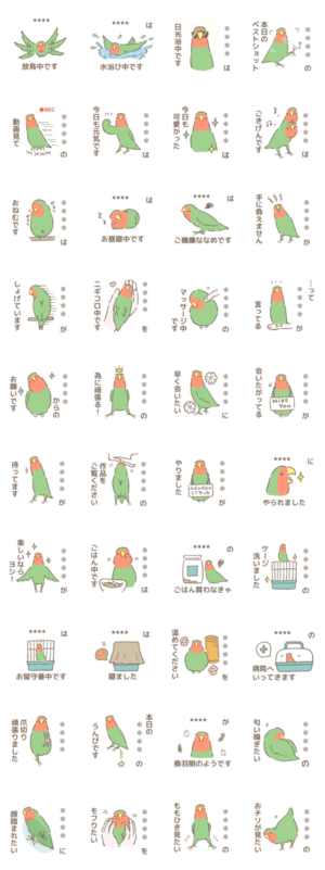 コザクラインコ(ノーマルカラー)のカスタムスタンプです。おうちの子のお名前(5文字まで)を入れてお使いください。「●●ちゃん」がオススメです。