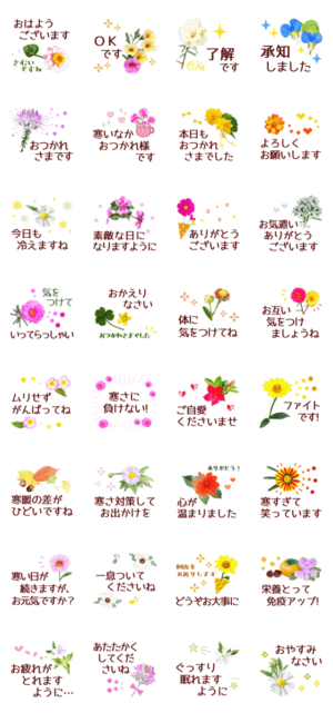 厳しい寒さが続く日はとくに体を大切に労わってほしい。そんな心優しい人に送受信してほしい気遣い花スタンプです。寒暖の差で体調を崩しやすいころにこそ心温かい日常を
