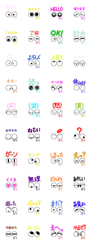 かわいい目玉の日常会話・あいさつ・気持ち 了解 はじめまして おはよう HELLO 帰ります ごめんね またね どうしたの? よろしく 上見て OK トホホ 今起きたあずはふざ より発売