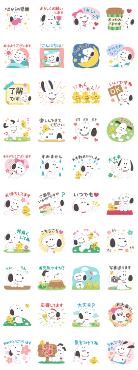スヌーピーのあいさつことばのスタンプです。毎日のトークに使えるあいさつ言葉や敬語がいっぱい。新生活にも大活躍♪春らしいポップなスタンプで気持ちを伝えよう♡