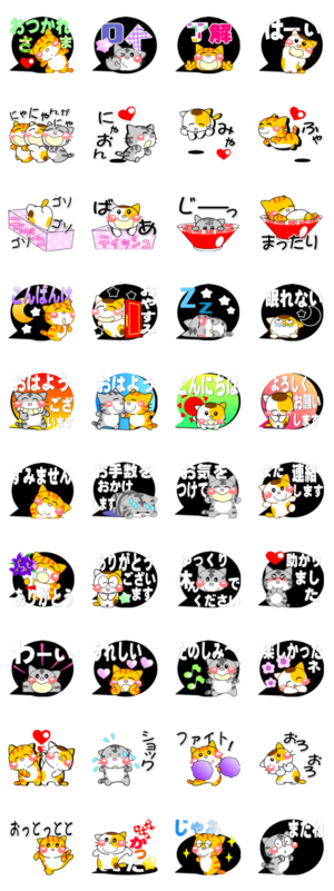 いつでも楽しく使いやすい可愛い3匹の猫達の黒い吹き出しのスタンプです。ohausa より発売
