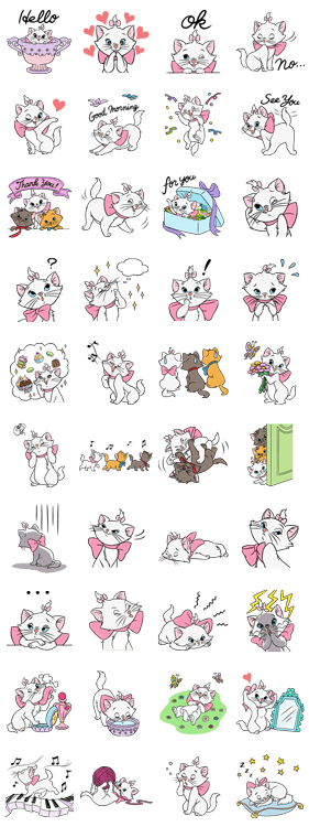 「おしゃれキャット」に登場するキュートなマリーのスタンプ。子ネコらしいキュートなポーズや、ちょっぴり背伸びしたレディーな表情など、可愛さたっぷり詰まってます♪ウォルト・ディズニー・ジャパン(株) より発売
