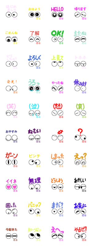 かわいい目玉の日常会話・あいさつ・気持ち 了解 はじめまして おはよう HELLO 帰ります ごめんね またね どうしたの? よろしく 上見て OK トホホ 今起きた
