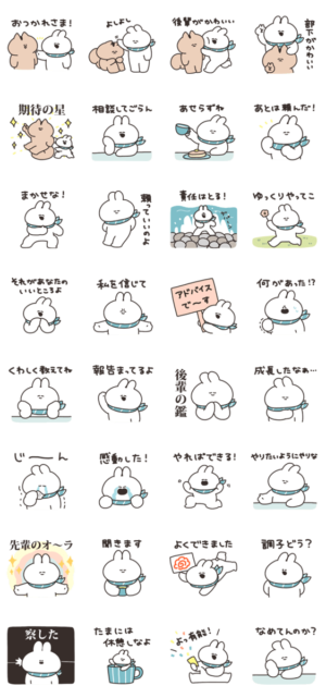 うさぎの先輩のスタンプです。後輩のリスも少し登場しています。ナポリ より発売