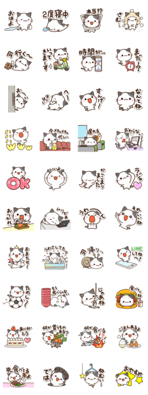 『ちびブチ』の、ブチ猫スタンプから、ちょっぴりシュールな『家族連絡』編です。仕事や家庭、恋人同士でも使えるネコスタンプ。ねこ好きの方にぜひ。【かたこ】かたこ より発売
