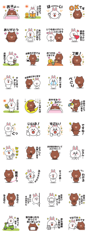 BROWN & FRIENDSの日常でよく使う言葉を集めたとっても使えるスタンプです。挨拶や敬語、丁寧語があるので、家族や友達にも使えます。