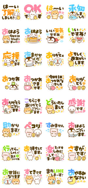 棒人間、ぺんぺん、ほいっぷ、豆柴日和、ねこにゃん、ぽこちゃんが大集合♪カラフルで大人可愛いほのぼのスタンプ♪敬語もいっぱいです。犬・猫・うさぎ・ペンギン