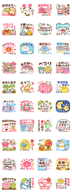 【かずえ】名前/ちゃん/あだ名。カズエ、Kazue、和江等❤【天気&日常】15 お名前スタンプ !挨拶に天気で会話が続く!❤タメ語と敬語両方入❤探【○○○usa】作:usakazu