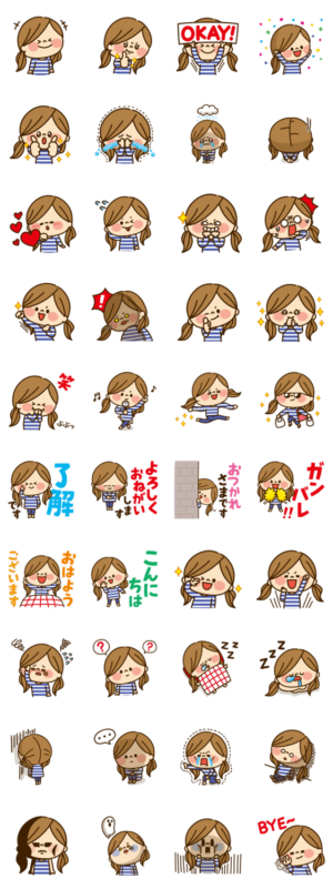 よくある普段着っぽいボーダーのロングTシャツが可愛くて、しかも2つに分けて髪の毛を言われている落差が日常的な主婦の可愛さを伝えてくれるスタンプで気に入りました。
