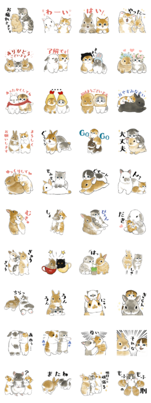 mofusandさんのスタンプはどれも可愛くて、特にうさぎと猫の組み合わせが最高だと思いました。友達にもよく使っています。