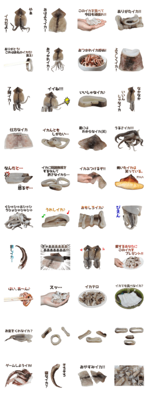 イカの写真で作ったスタンプです。いかのスタンプで、トークルームをぬるぬるにして歯ごたえのある会話をしてください。烏賊、魚介類。ダジャレ。実写食べ物スタンプ。