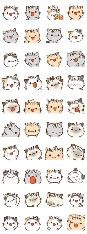 『ちびミケ』の三毛猫や、『ちびシャム』のシャムネコ、『ちびブチ』のぶち猫、アメショ等の5匹の猫が登場する、ドアップなスタンプです。ねこ好きの方にぜひ。【かたこ】
