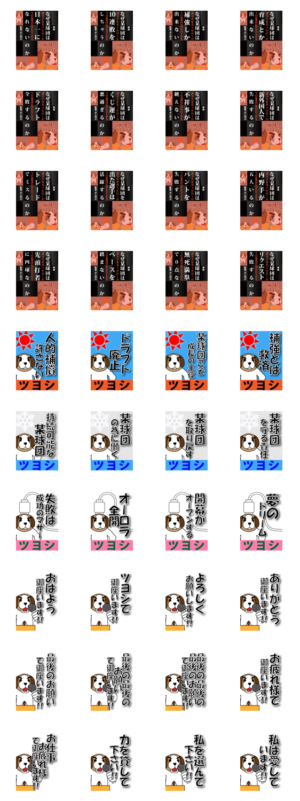 某球団が堕ちて行くのを黙って見てられない! 某プロ野球チームの応援にツヨシくんが帰って来た! みんなで選挙に行こう! 某球団の絵文字も宜しく! ビッグスタンプだよ! ※このスタンプはトークルームで大きく表示されるBIGスタンプです。よしのぶ より発売