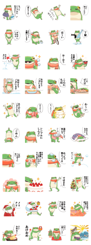 日常会話で使いやすい冬仕様のカエルスタンプです。 クリスマス、年末年始にも使えます。たろ より発売