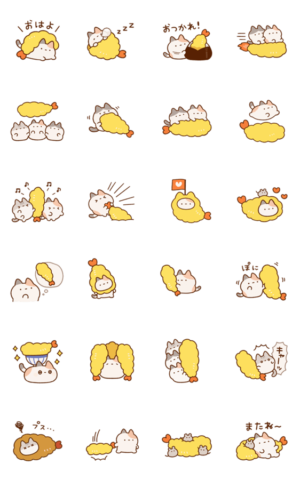 わがままボディな可愛い『ずんどうネコ』の激しく動くアニメーションスタンプ♪今回はえび天がいっぱいです!