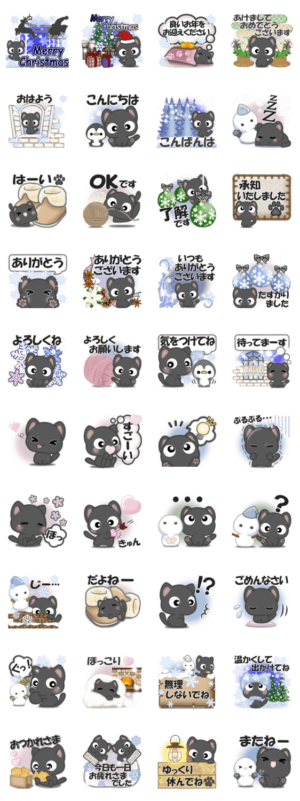 寒い季節に毎日使える黒ねこのほのぼのスタンプです。ぽてこ より発売