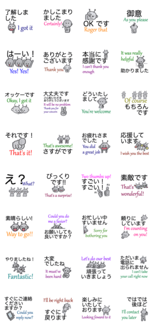 毎日使える、見やすい大きな文字のスタンプです。グレイな奴らがあちこちに顔を出して、スタンプに花をそえています。ビジネスでも活躍するシリーズです。